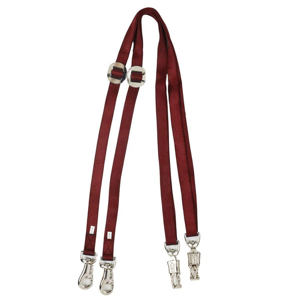 A safe, reliable and reusable method for tethering horses. Made of 1″ heavyweight poly webbing with a malleable iron bull snap on one end and panic snap on the other end. The panic snap is designed to hold a horse under normal circumstances, yet release a panicky horse. This feature greatly reduces the risk of injury to horses and humans. Adjusts to 7′ long.