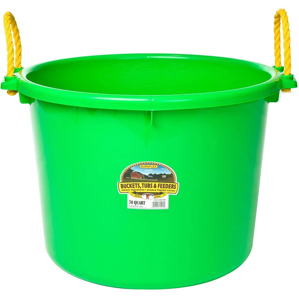 The perfect solution to a never-ending problem! The Little Giant 70-Quart Muck Tub can help you handle big or small cleanup jobs with ease. The ample mouth size lets you load it up fast, and the poly rope handles are strong and comfortable. Made from high-density polyethylene to protect against warpage and help prevent stress cracks. 21.75 inch diameter (exclusive of handles) by 17.25 inch high, holds 70 quarts (17.5 gallons).