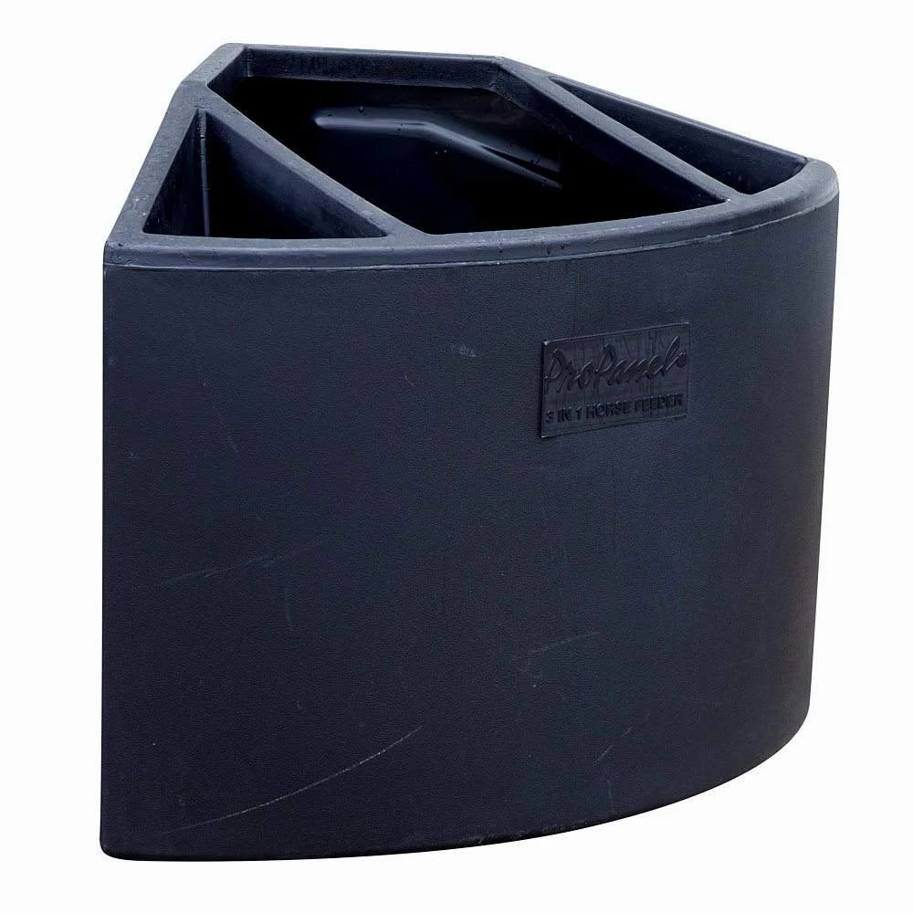 The Compact Grazer 3-in-1 horse feeder is designed for use in box stalls or pens and are perfect for feeding hay cubes or pellets to your horses or ponies. The feeder is a one piece molded polymer design that has a center cavity for hay pellets or cubes and a smaller cavity on each side for grain and salt.
